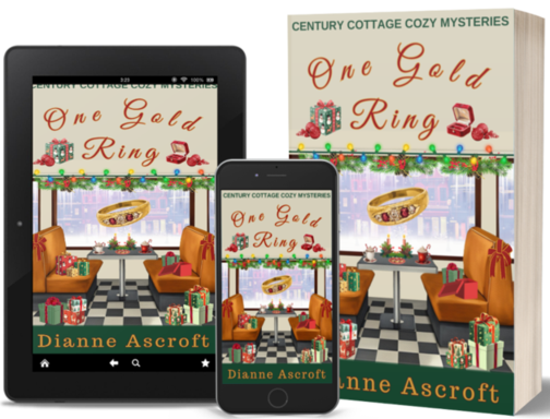 One Gold Ring is a holiday-themed novella set in the fictional small Canadian town of Fenwater and part of author Dianne Ascroft’s delightful Century Cottage Cozy Mystery series. When Marge Kirkwood carelessly leaves Bruce Murray’s family heirloom, a vintage diamond and ruby gold engagement ring, lying unattended at their table at the local diner, it tragically goes missing just as the ring’s intended recipient, Marge’s best friend, Lois Stone, arrives to join them for breakfast. Frantic to recover the ring without spoiling the surprise of his upcoming yuletide proposal, Bruce and Marge go to great lengths tracking down possible suspects who had access to the ring, with Lois helping them every step of the way.